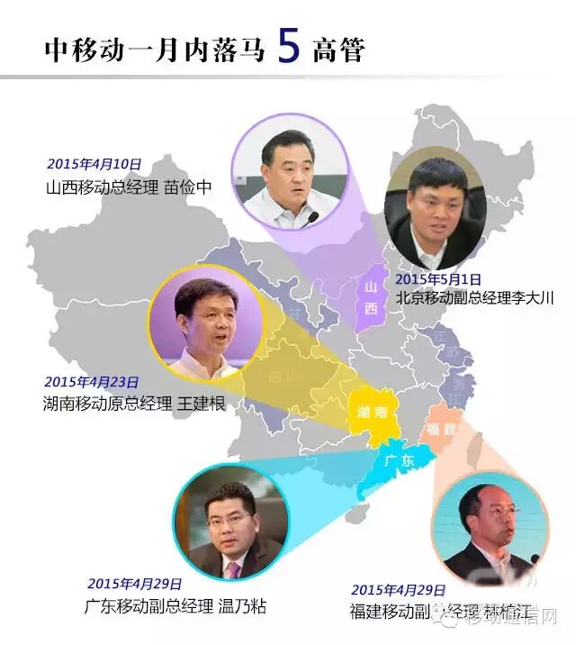 4月20日,湖南移动原总经理王建根被相关部门带走调查,王建根自1999年湖南移动创建之初即担任总经理一职,至2013年前后才正式退居二线,掌管湖南移动十余年。