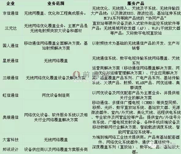 综合来看,无线通信网络优化产业龙头企业中涉及无线网络覆盖设备供应商和服务商主要有京信通信、三元达、国人通信、星辰通信、三维通信、虹信通信、奥维通信、大富科技、邦讯技术等企业。