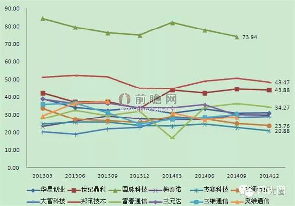 结合2013-2014年,主要企业毛利率季度变化趋势图来看,在2013年初部分企业毛利水平高于2014年毛利水平,国脉科技毛利仍处于较高水平,邦讯技术、世纪鼎利、富春通信毛利率均处于较高水平,在34%以上。
